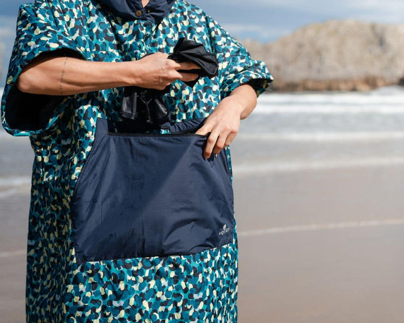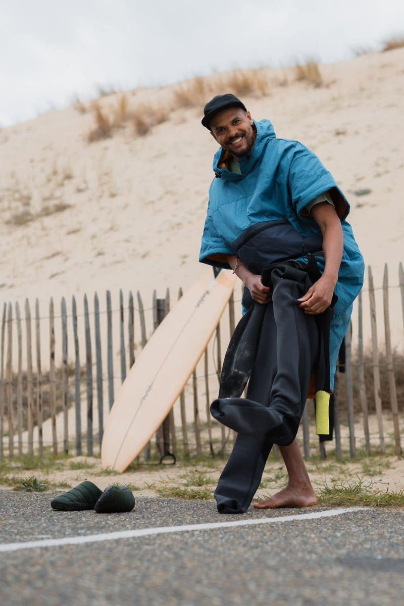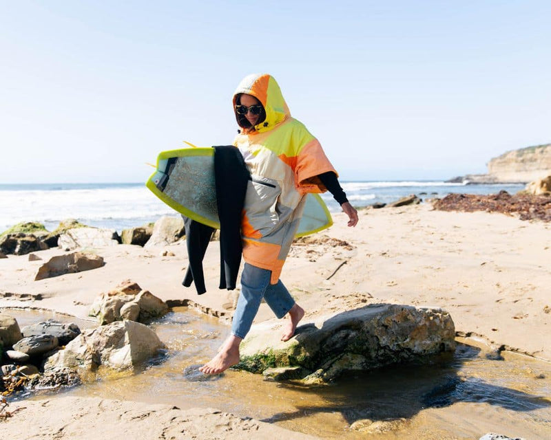 Made from 100% recycled 50D REPREVE® Ripstop fabric, it features a waterproof exterior and a quick-dry microfiber fleece lining, ideal for post-surfing or wild swimming. The hooded design offers practicality for wetsuit changes or as a personal shelter, combining functionality with comfort in outdoor gear.