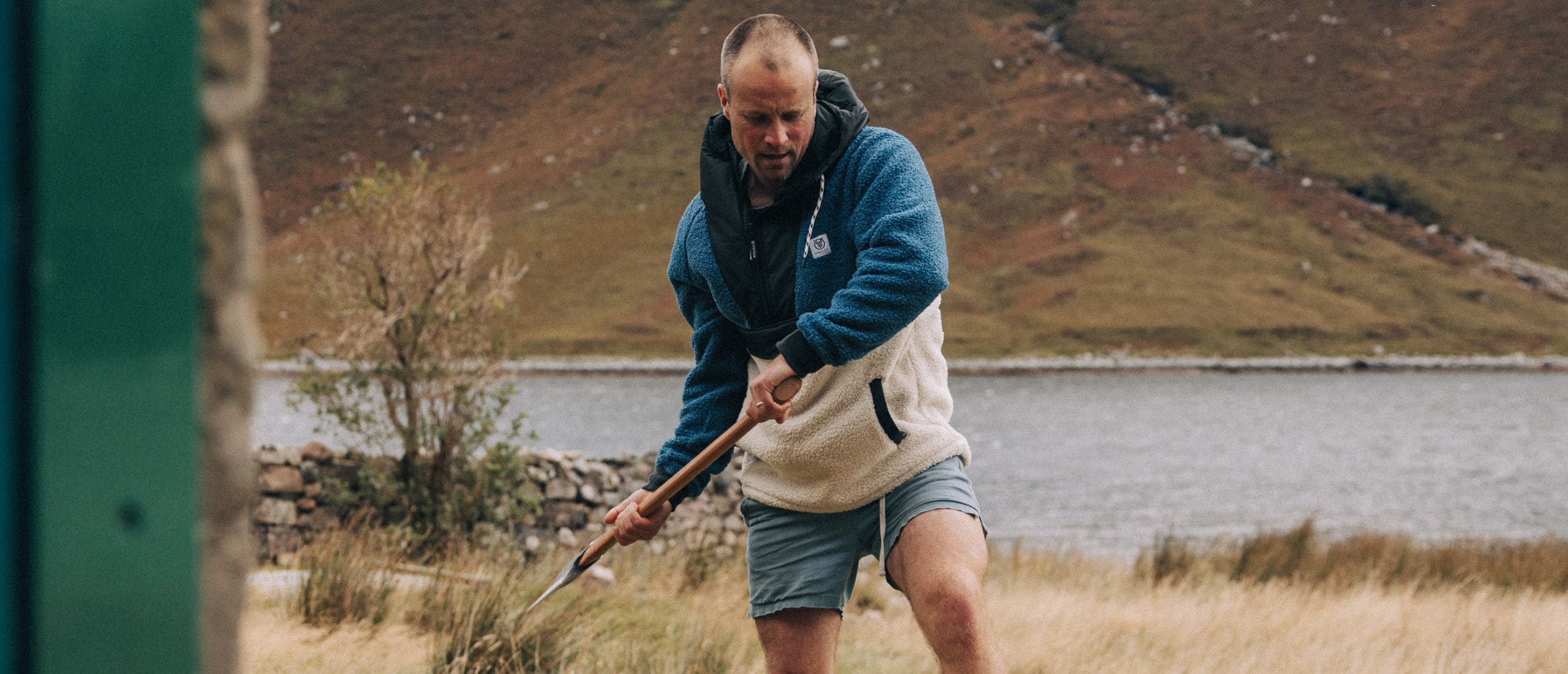 Man in outdoor clothing using a tool by a campfire with a scenic lake and mountains in the background