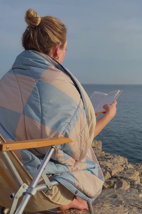 Switches from cosy blanket to hands-free cape to supportive neck pillow. Reversible 50D recycled Ripstop and 100% recycled polar fleece keeps it lightweight, packable, weather-ready, quick-drying, and machine washable.