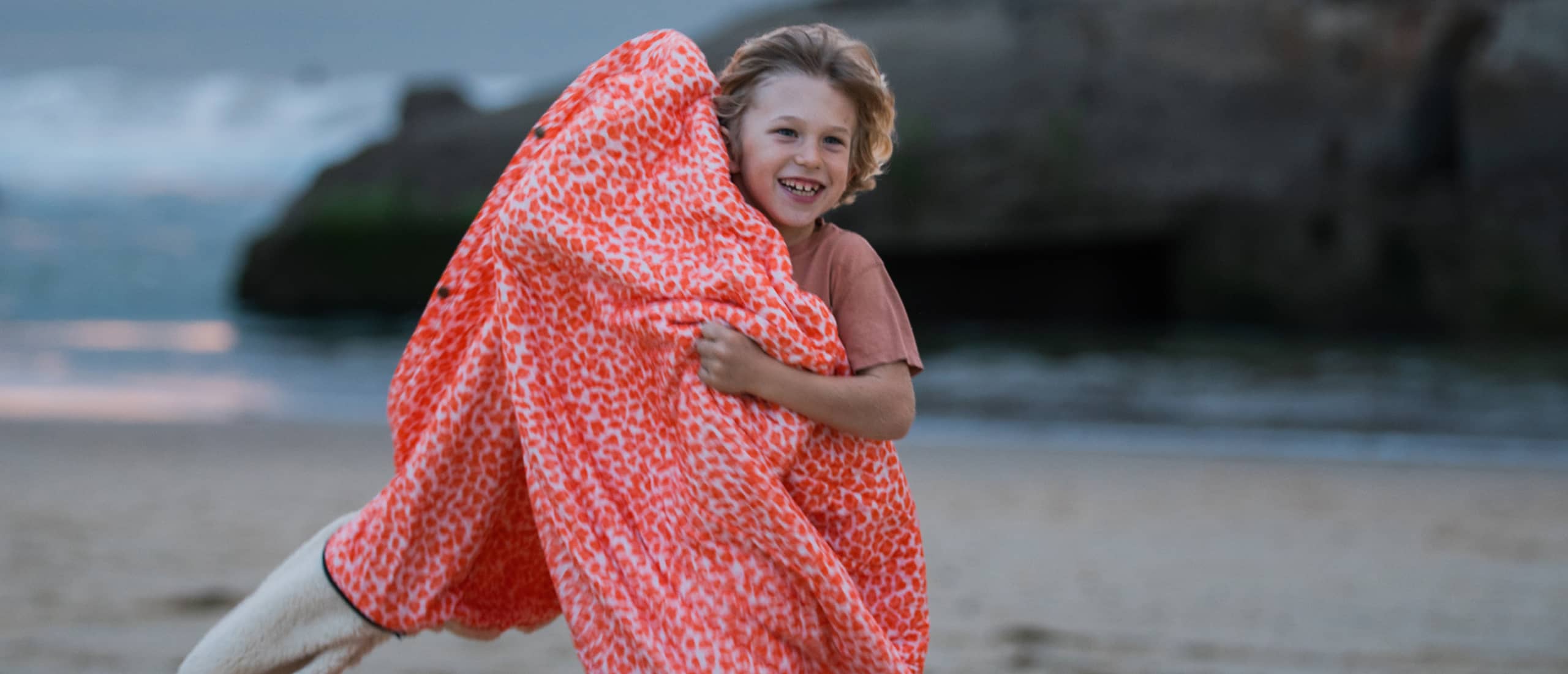 Notre couverture de voyage est une couverture à capuche polyvalente et compacte, fabriquée à partir de matériaux 100 % recyclés.